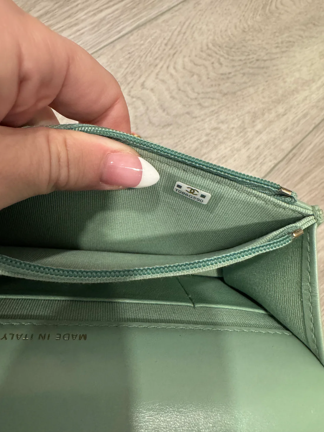 Cc top handle quilted calfskin phone holder. Has top handle and crossbody strap. Chain has shades of pink and green woven into it. Fits iPhone max.