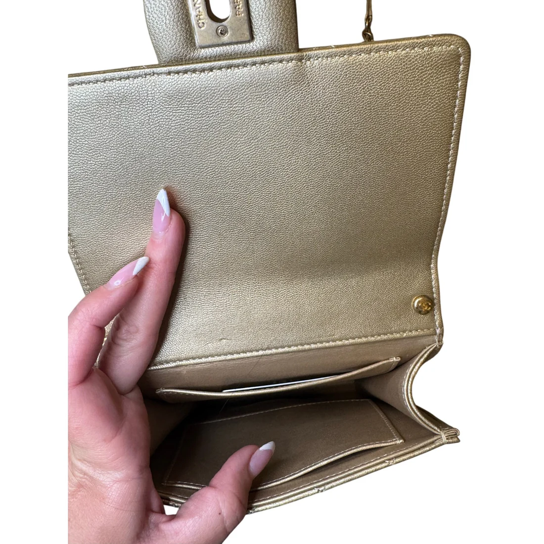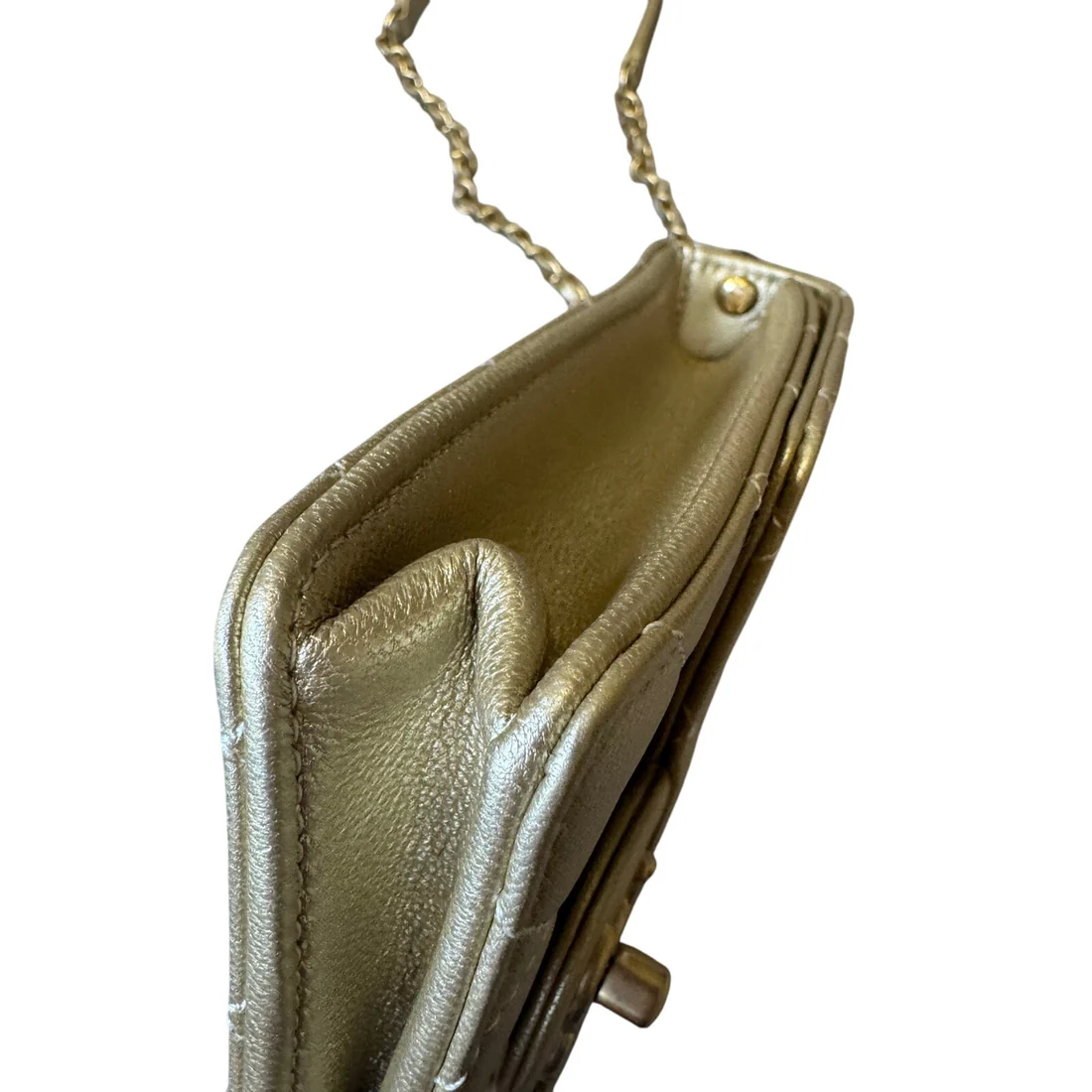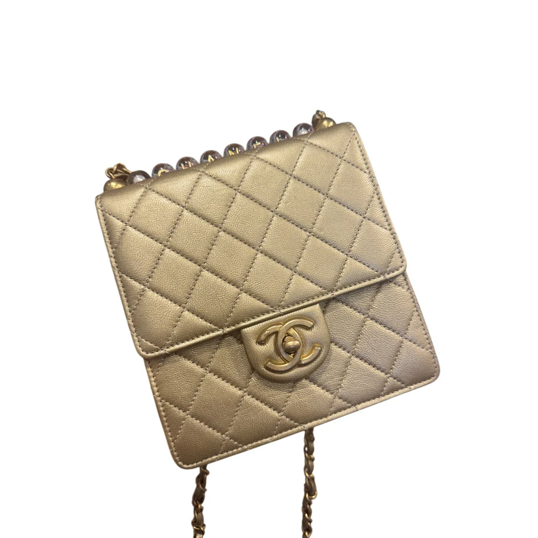 Chanel Metallic Goatskin Quilted Chic Pearls Flap Gold. Beautiful condition comes with dustbag and authenticity card. Excellent condition with no signs of wear.