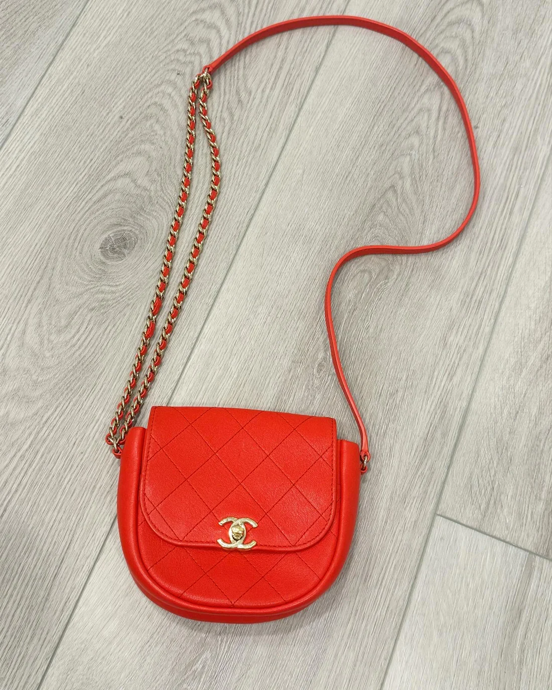 Chanel red calfskin shoulder bag with light gold hardware. Excellent preloved condition. Does fit a max size iPhone. 26 series