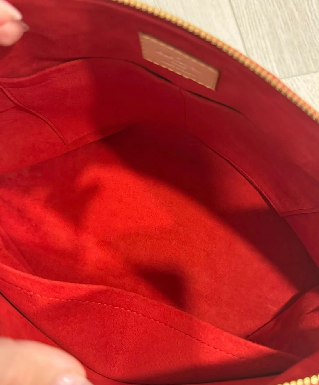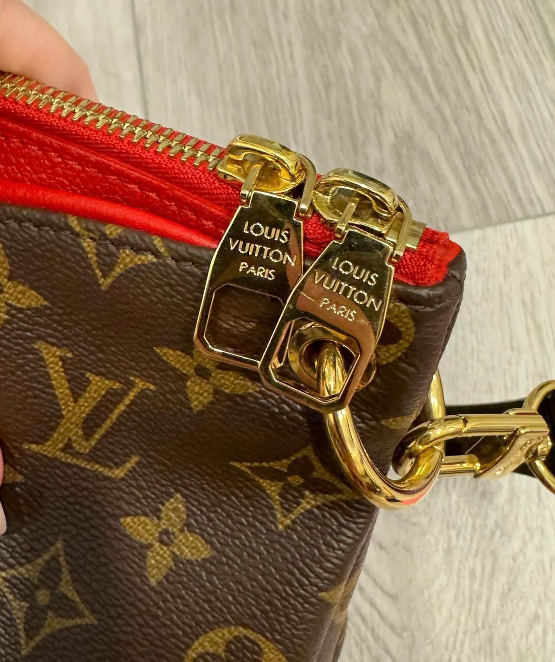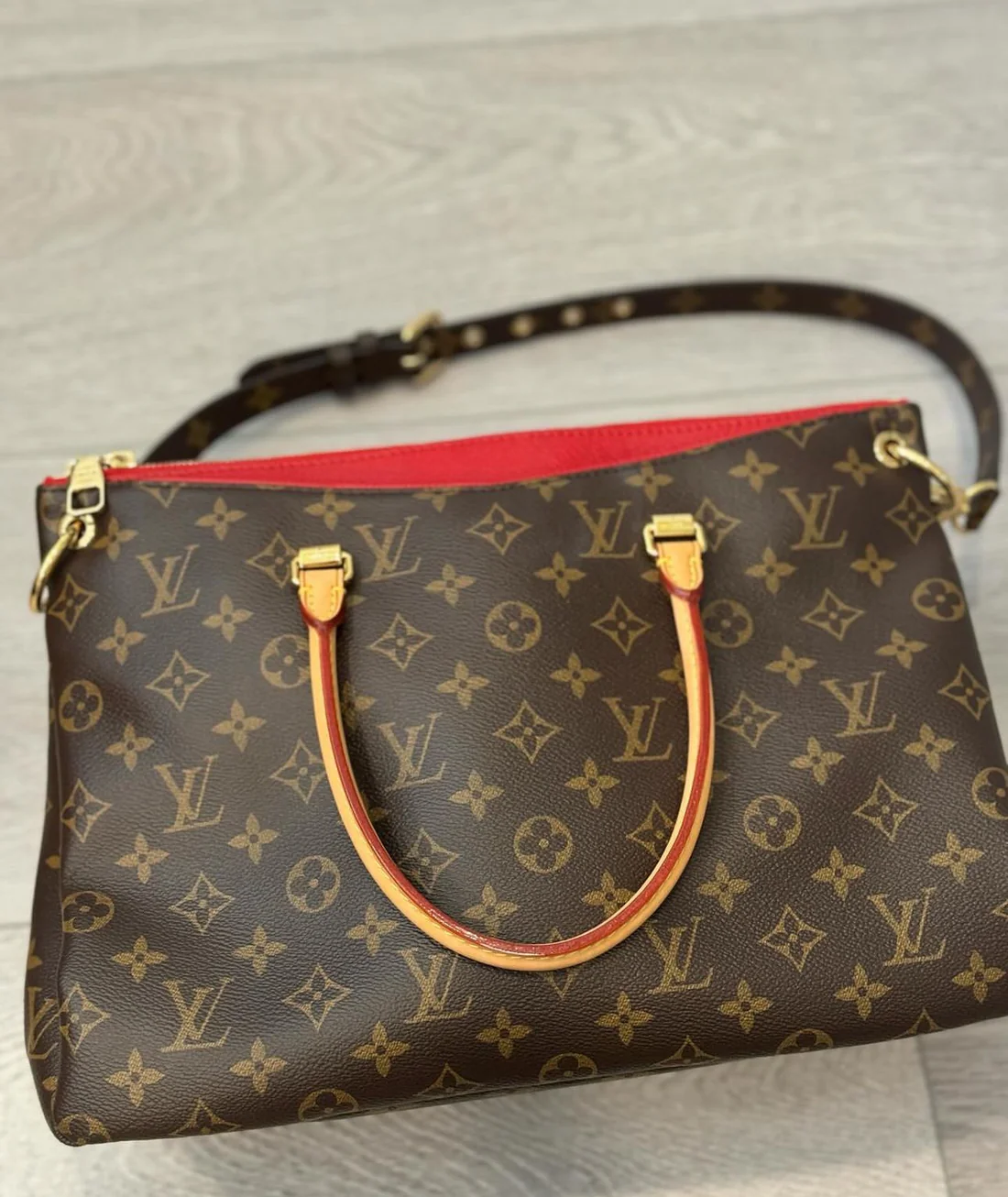 LV Pallas Monogram in Red. Excellent condition. Very clean. Comes with shoulder strap and dustbag. Only wear is very little marks on feet. No corner wear.